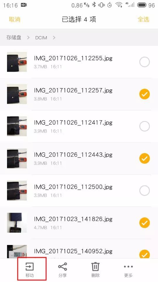 6、如果一些照片不想备份,我们可以在全选之后,找到不需要拷贝的照片,手指轻轻点击就能取消选定;选定照片后,点击手机左下角的“移动”按钮;