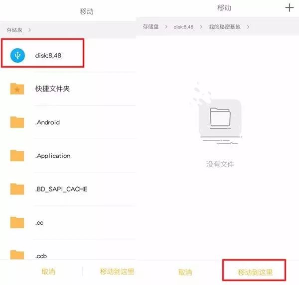 7、找到U盘所在位置“disk”,找到要拷贝照片保存的文件夹后,点击“右下方”的“移动到这里”。