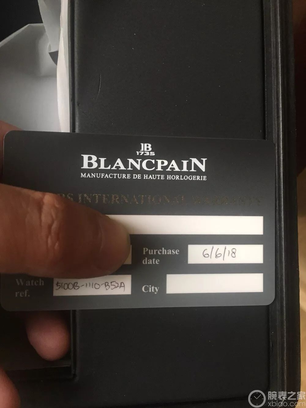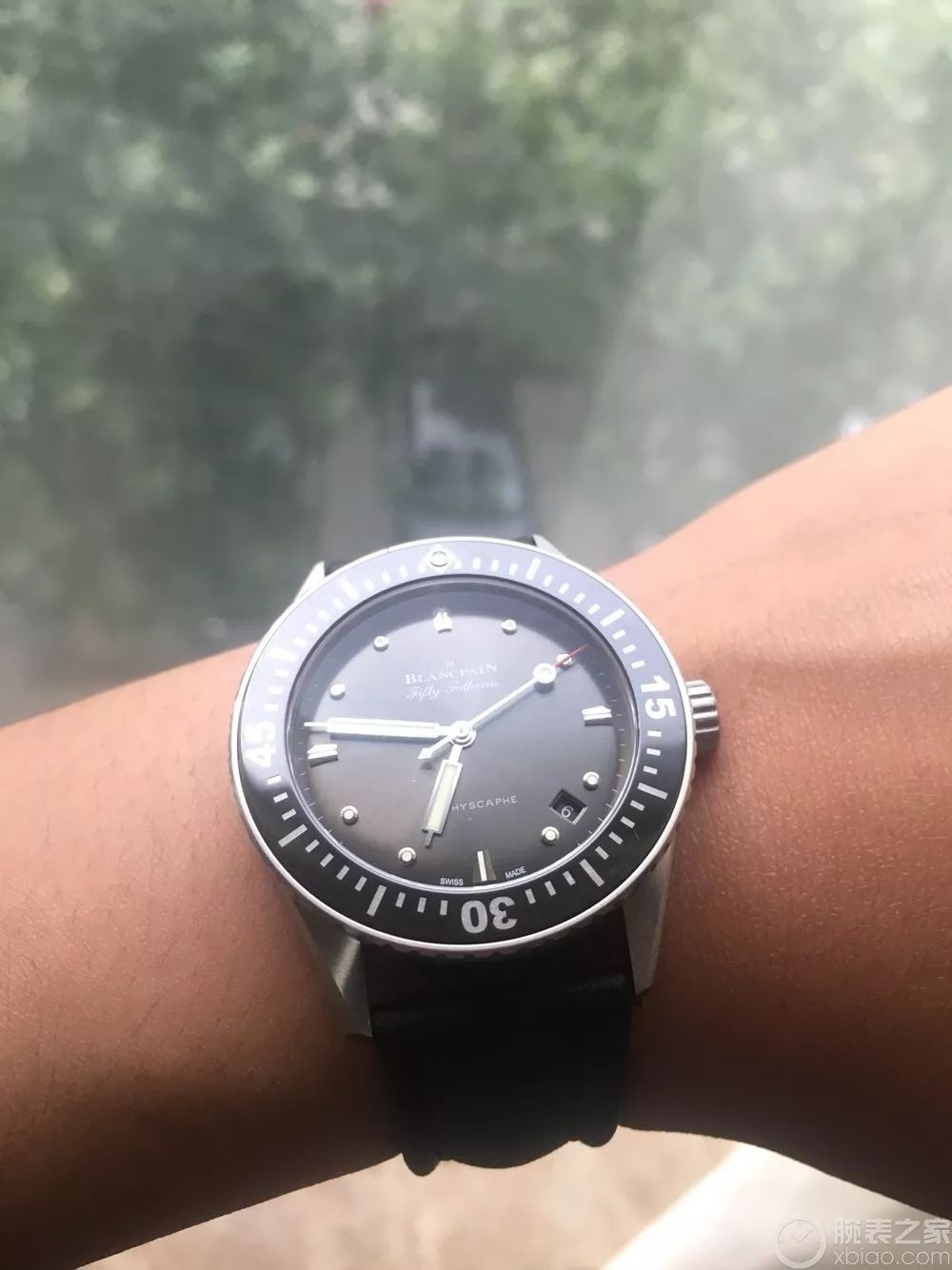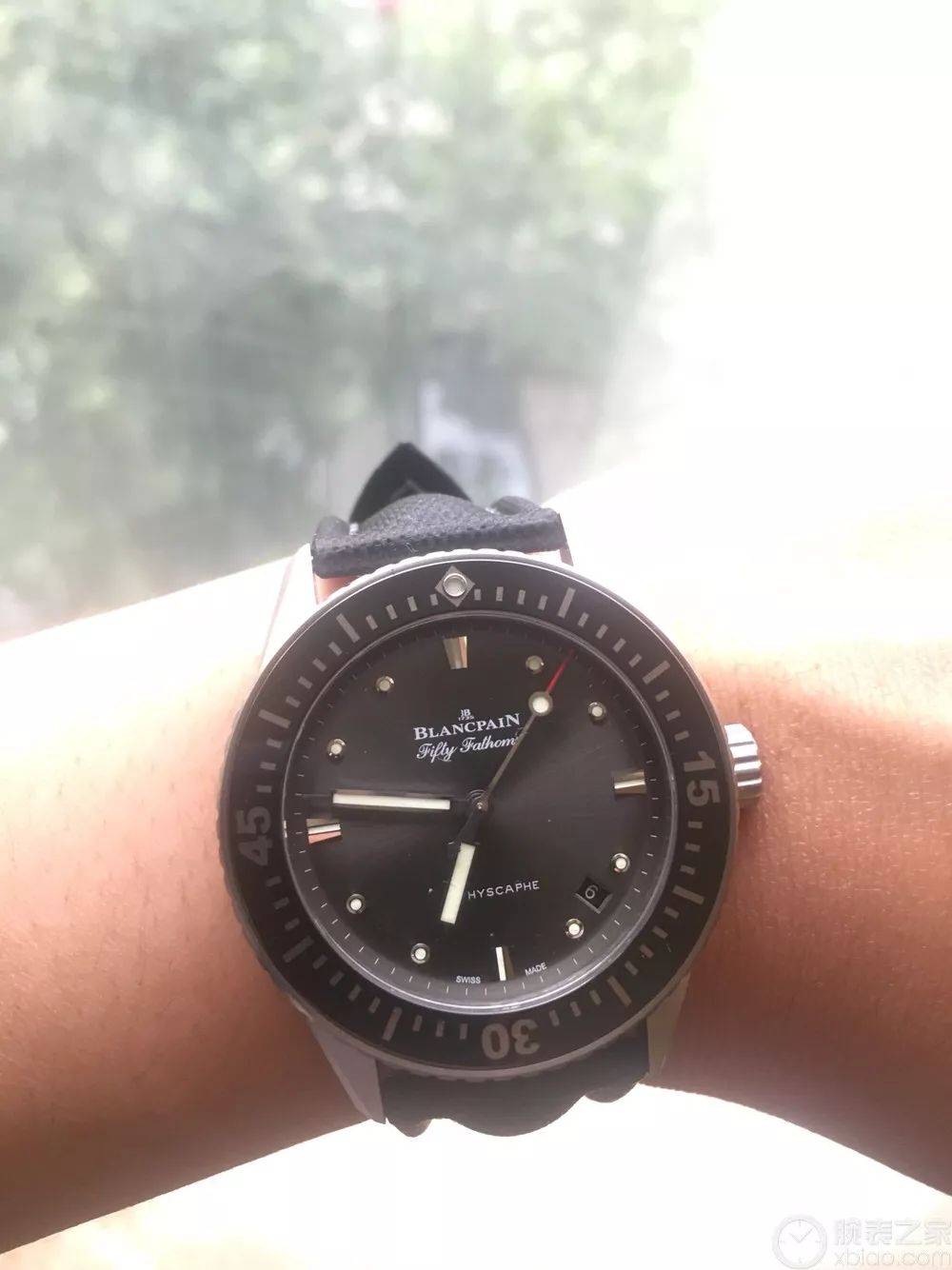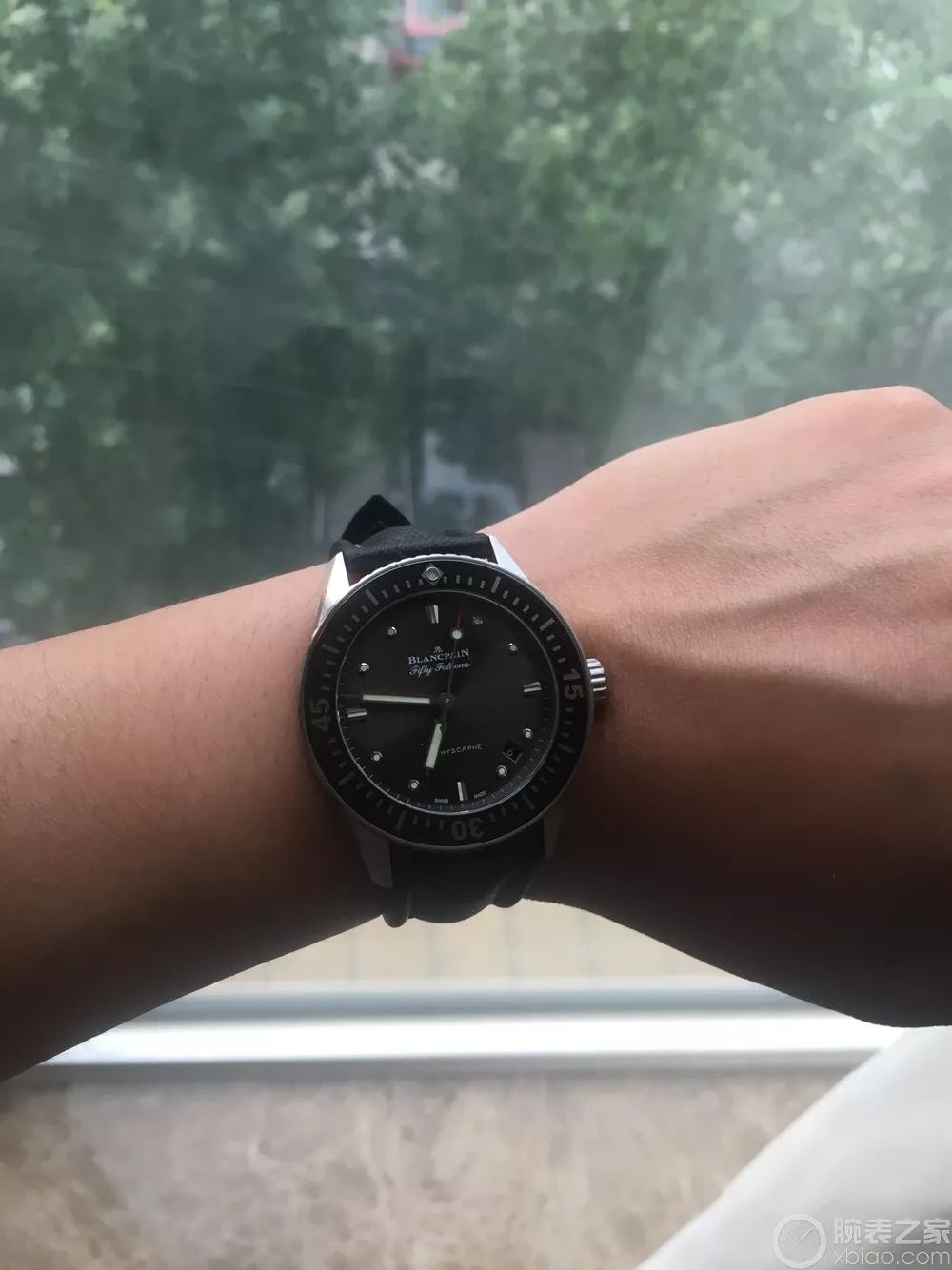 刚刚入完劳力士114300,又开始蠢蠢欲动了。最近几年非常流行潜水表,跑过专柜试过水鬼,43的五十噚,都无法驾驭,只因本人手腕比较细,苦逼啊,在宝珀上海专柜试表的时候店员告诉我有一款38的应该适合你,我喜出望外,最后又说可惜没货,又掉入冰底。 离开了专柜,还是心心念念店员所说的话,随后微信联系,对方说可以帮忙问问,一天后答复我,可以订货,2个月左右,对于我这种急性子来说简直是灭顶之灾啊,而且也有顾虑,毕竟没上过手,不知道效果如何。 就这么过去了一个礼拜,说巧真是巧,业务上需要给客户送礼,对方指定的竟然也是这款礼物,不过是蓝色的,这回好了,我得找两块了,通过各个朋友找,终于功夫不负有心人,在香港的一个角落找到一款蓝色的,三天后朋友带回来,上手了一下(忘了拍照了,晕)这回彻底种草了,真适合我啊。 表送出去了,我的欲望更强了,又托全世界的朋友找,一周下来回复只有大表盘的,这回郁闷了,正当准备放弃之时,有个朋友找到现货,二话不说直接预定,感谢朋友看我的流水账,下面上图