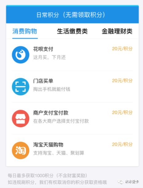 比如消费购物,花呗支付每20元=1积分,月限制600积分;门店买单,20元=1积分,月限制150积分;淘宝天猫支付,20元=1积分,月限制600积分...这么一看就吓软的,以上每日最多获得1000积分,这还得分类别,有上限了。