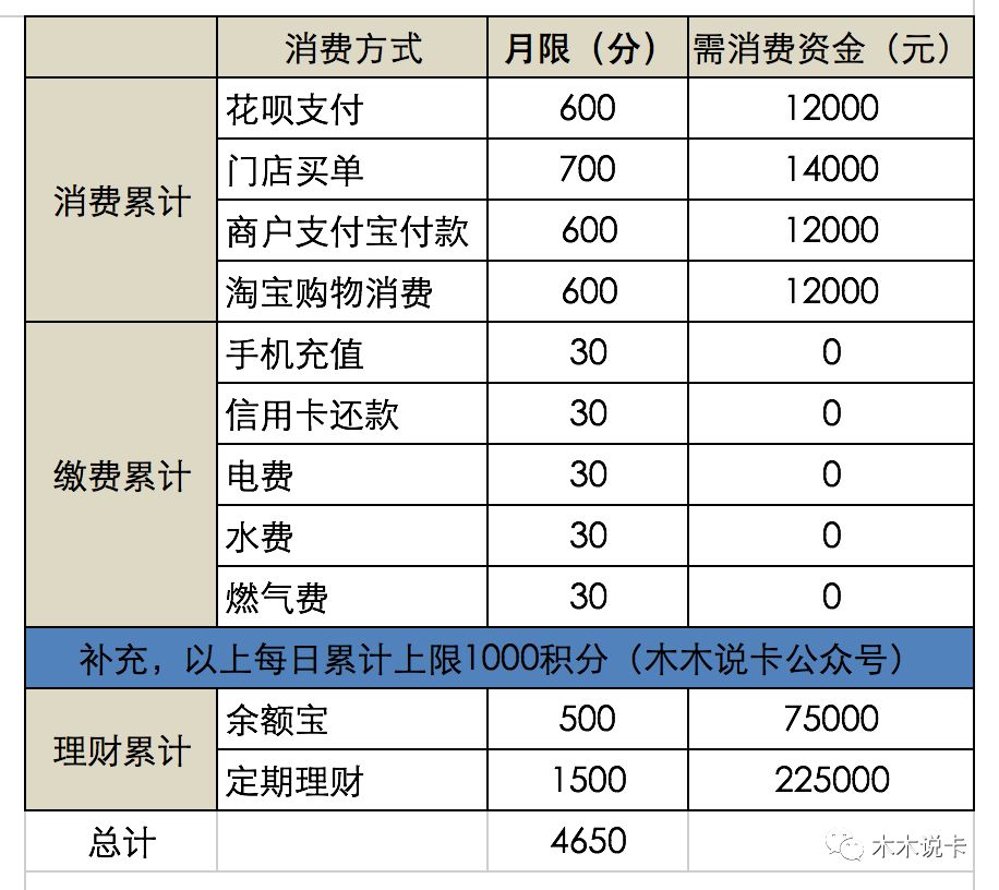 ps,以上这些支出每日最多获取1000积分,不含理财赠送积分,余额宝理财最多获得500积分,定期理财/基金最多1500积分。