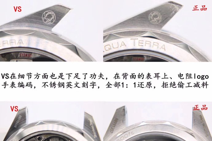 表耳细节对比,VS厂也是在细节方面也是下足工夫,在背面的表耳上,欧米茄LOGO,手表编码,材质钢材等刻字全部都是一比一复刻的!和原版一致!