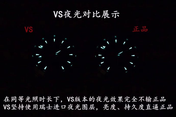 夜光对比。夜光方面,在同等光照时长下,VS厂欧米茄海马150米柚木系列的夜光效果完全不输正品,VS厂坚持使用瑞士原厂进口夜光涂层,亮度和持久性方面都不是直逼正品。 以上就是这期测评对比讲解,希望大家会喜欢这篇文章,HO表叔,顶级复刻欢迎你来撩:HO56888,普通高仿请绕道。 |