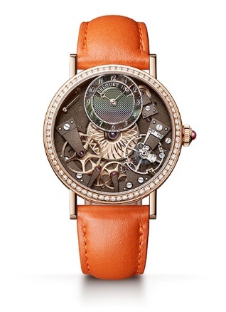 宝玑Tradition传世系列7097自动逆跳秒针腕表 宝玑Tradition传世系列7038女士腕表 于宝玑而言,机械构造与女性魅力在女士腕表设计中同等重要。为将两者兼顾并达到最佳平衡,宝玑Tradition传世系列7038腕表采用偏心大溪地珍珠母贝表盘,为繁复的机械构造增添了一抹柔美气息,亦使女性得以充分享受历来被视为男士专属的复杂机械之美。橙色真皮表带惊艳夺目,为腕表设计增添点睛之笔,与镶嵌璀璨钻石的表圈碰撞出迷人的火花。腕表搭载精心润饰的自动上链机芯,配备硅质游丝,凝练汇集宝玑精深的制表造诣。
