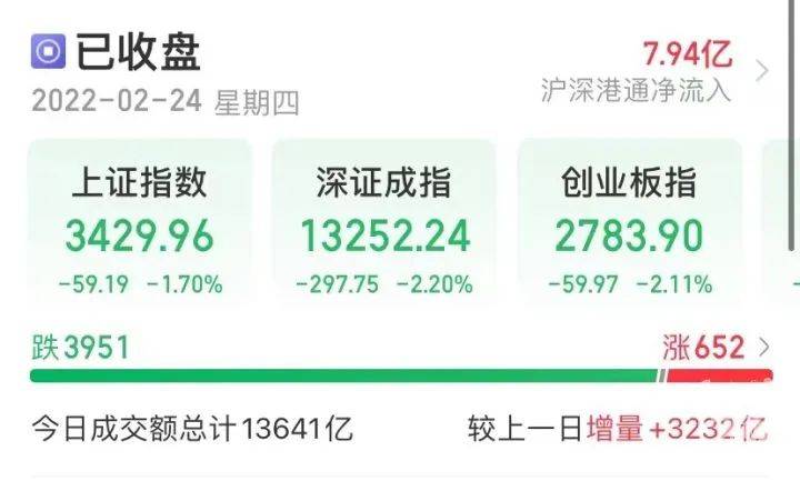 两市个股跌多涨少,合计3951只个股下跌。市场成交量放大,再次突破万亿,接近1.4万亿元,行业板块多数收跌,贵金属、船舶制造、采掘行业逆市大涨。 亚太主要股市也是类似走势,中国香港股市、日本股市、韩国股市均出现一波明显的跳水,其中港股恒生科技指数再创发布以来新低,截至收盘,恒生指数下跌3.24%。 俄罗斯股市彻底崩了。其中俄罗斯RTS指数开盘下跌34.7%,俄罗斯MODEX指数跌28.5%,跌幅创历史之最。美国股指期货同样大跌,截止目前,标普500、纳指、道指期货均跌逾2%。