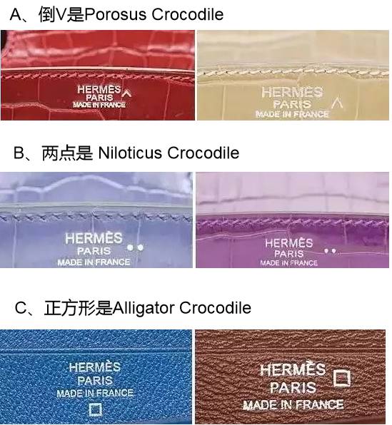 一种绒面的山羊皮,表面的划痕会随时间慢慢淡化,禁潮湿。 三、鳄鱼皮 鳄鱼皮主要种类: 1、Porosus Crocodile婆罗洲长吻鳄,价格最贵。 2、Niloticus Crocodile尼罗河鳄鱼,价格次之。 3、Alligator Crocodile,中国/美国养殖鳄鱼,价格最便宜。 这三者中,每一鳄鱼皮种类在名牌下有不同符号的表示。而其中的每一种皮又分为光面以及雾面,并且雾面比光面贵。