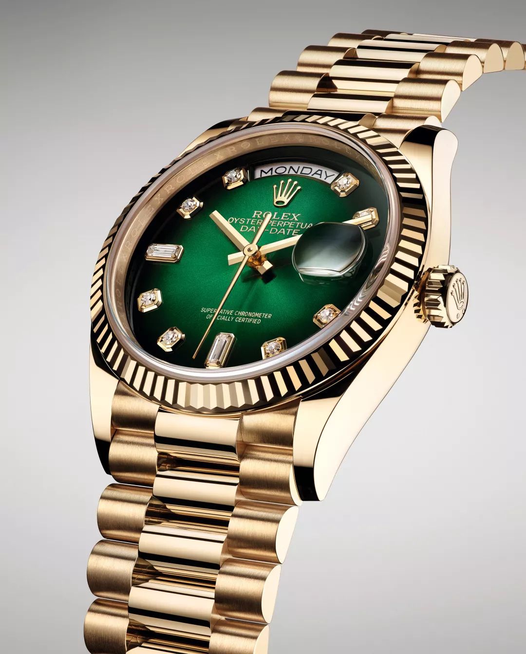劳力士推出新款蚝式恒动星期日历型36(Oyster PerpetualDay-Date 36),分别为18ct 黄金款、18ct 白色黄金款及18ct 永恒玫瑰金款,均搭配独特新表盘。部分新款搭配镶钻外圈。其中两款分别搭配崭新设计的同心渐变色表盘:一款为18ct 黄