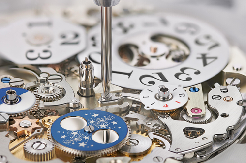 DATOGRAPH PERPETUAL TOURBILLON搭载L952.2型机芯;其压紧装置由一枚螺丝固定。它的功能在于固定闰年显示盘的位置。 2020年标志着崭新十年的开始,然而真正的腕表爱好者更关注它是一个闰年的到来,因为这是一个可以区别万年历腕表与年历腕表不同功能的特殊年份。人们在跨年之夜便满怀期待,直至午夜时分,腕表的闰年显示窗口的数字由“3”跳转为“4”。从那时起,直至万年历最终能够展现出其精妙之处,需要59天。万年历能够准确地显示2月28日到29日的切换,亦能在闰日的午夜时分直接跳转至3月1日。这看似简单,却意味着非同一般的技术挑战。制表师必须研发一种特殊的机械机制,记录四年内48个月的不同长度。 TOURBOGRAPH PERPETUAL “Pour le Mérite”搭载L133.1型机芯;机械机制的齿轮轴承经过润滑处理。它每四年转动一圈,记录四年内48个月的不同长度。传统设计 传统上,这一功能是由一个带有48个凹槽和步进的程序轮完成,对应着四年周期中由三个平年与一个闰年所组成的48个月的不同长度。齿轮每四年才旋转一圈,其凹槽和步进由一枚杠杆取样。凹槽越深,装置就越快切换到下个月1号。最深的凹槽对应每年二月。仔细观察,会发现其中一个凹槽的深度略微浅。它是对应着闰年的二月,比平年多出一天。此机械机制能够识别一个世纪中不同长度的月份。日期只需要在2100年、2200年和2300年校正一次,根据格里高利历法(Gregorian Calendar),它们并非闰年。 在朗格推出的八款万年历复杂功能腕表中,其中七款腕表均配备基于这种传统原理的万年历和其他繁多的复杂功能。然而LANGE 1 TOURBILLON PERPETUAL CALENDAR采用的是一种全新的设计原理。
