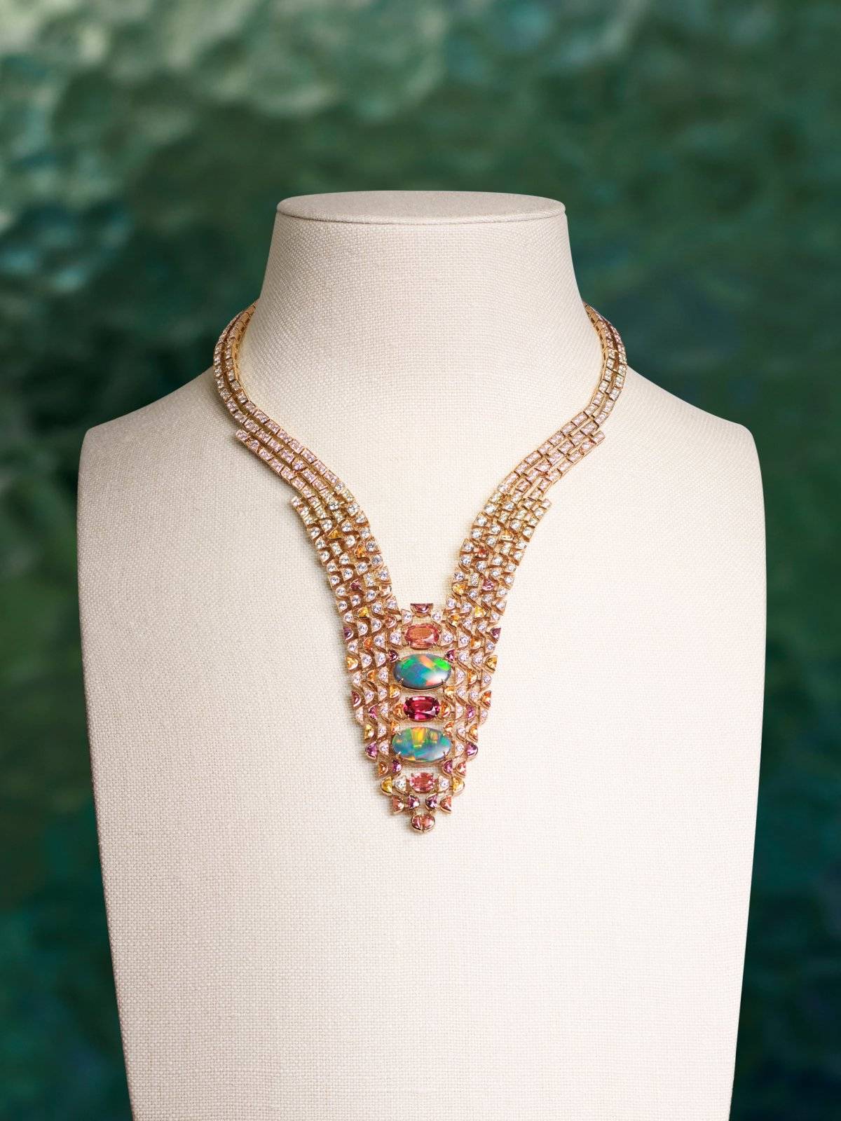 全新高级珠宝系列的CAFAYATE项链聚焦一对华美欧泊,通过丰富配色烘托其迷人虹彩。欧泊的红、橙和黄色光芒,与交错排布的三颗彩色蓝宝石相互映衬。一系列Umba蓝宝石的丰富色彩和谐交融,令温暖色调延伸至整件作品,达到精妙平衡。反复排列的几何图案延展成柔美曲线,契合中央宝石的椭圆形轮廓。