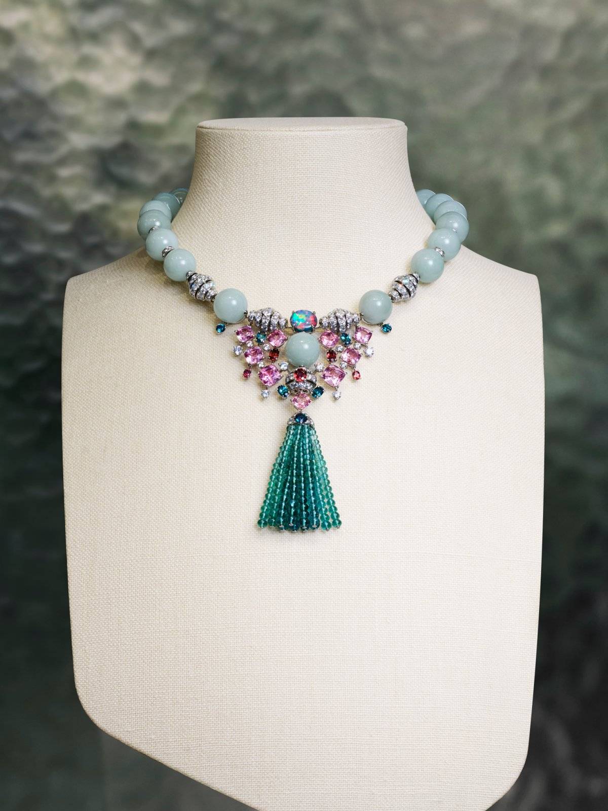 最新的“SEAFOAM GREEN CHAMANE项链”展示了立体几何造型的现代高就珠宝。采用绿玉髓、蓝宝石交相辉映,再由白色钻石和黑色缟玛瑙进行串联。