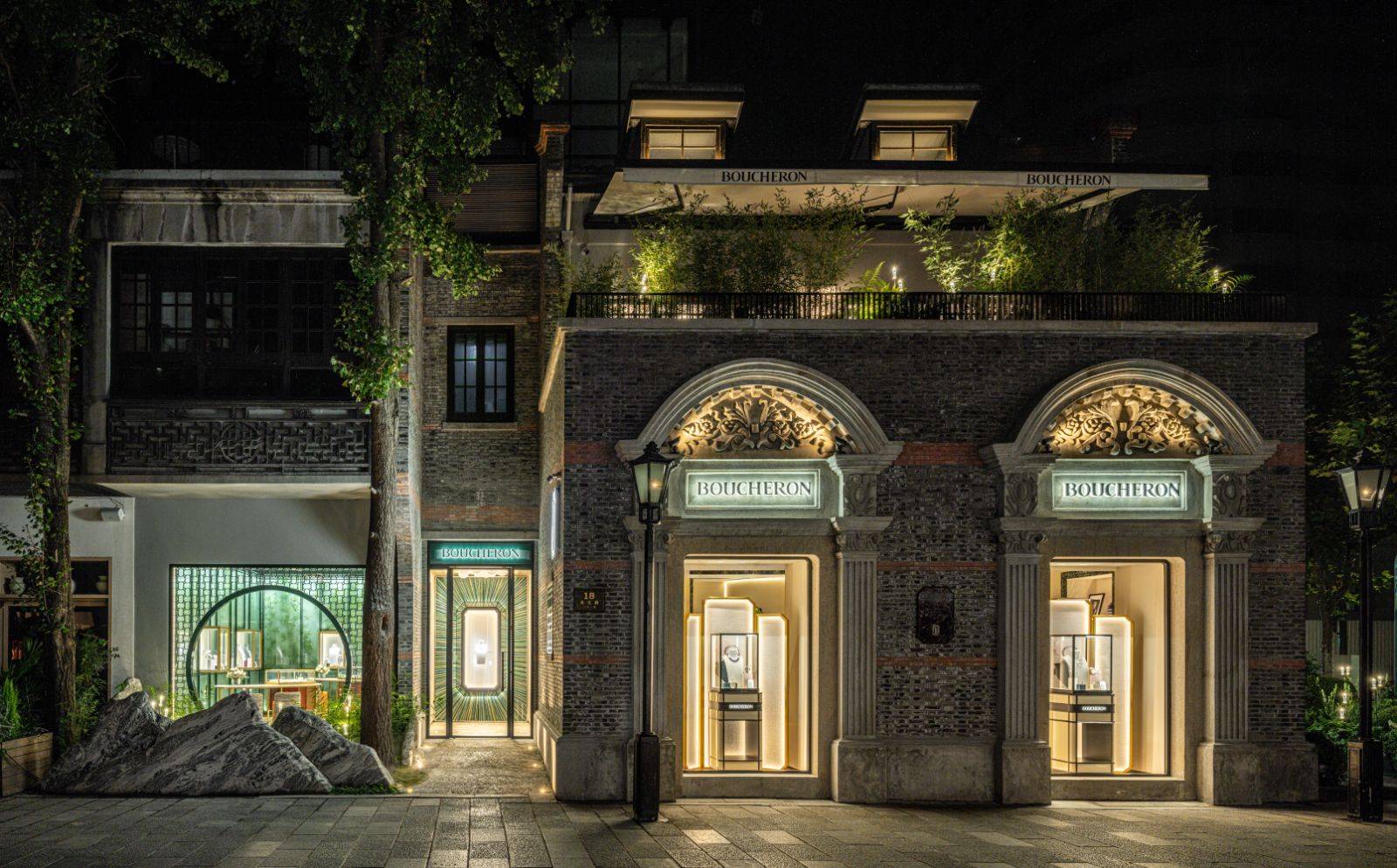 首先,宝诗龙请来景观工作室“鸣筑景观”在旗舰店内打造了两座庭院。其一为旗舰店入口处的法式庭院,是对品牌芳登广场旗舰店中的冬景花园的重新诠释。旗舰店的第二入口处则被设计为中国古典园林,用中式庭院中常见的“月洞门”进行不同空间的自然过渡。“月洞门”的四周则采用石雕、水景,以及中国古代地面纹样的马赛克石砖,辅以丰富的自然元素,营造浓郁的东方美学意境。