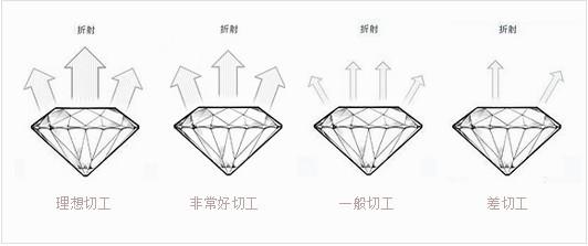 石的切工是重要的标准。根据国家标准切工可分为很好、好和一般三级。而国际上除上述三级外还有差(Poor)这一级。做工优良的钻石各部分之间有一定的比例需要用仪器来仔细测定,才能得知它是很好、好还是一般。同样大小、同一色级、同一净度的钻石,由于切工的好坏,其价格可相差数倍之巨。切工的好坏直接影响钻石的火彩度。切工优良的钻石,散发出耀眼夺目的光芒,切工不良的钻石,边缘显得不锐利,光芒顿减。大自然赋予每颗钻石原石不同特征的瑕疵,然而通过切磨师的切磨,却可取其精华,弃其糟粕,还原钻石的天然美丽,创造最大的价值。